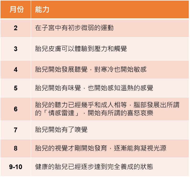 經過長時間的研究發現,胎兒從受孕起,其實就存在著十分可觀的潛在能力,有習慣也有情緒,更驚人的是胎兒還有記憶,他會對反覆的資訊刺激產生固定模式的條件反射。一般來說,胎兒在 2 個月的時候就已經可以在子宮中有初步微弱的運動了,3 個月的胎兒皮膚已經可以體驗到壓力和觸覺,4 個月的胎兒開始發展聽覺,對寒冷也開始敏感,5 個月時,胎兒開始有味覺,也開始感知溫熱的感覺,到了 6 個月,胎兒的聽力已經幾乎和成人相等,而腦部發展出所謂的「情感雷達」,開始有所謂的喜怒哀樂,7 個月的時候,胎兒開始有了嗅覺,到了 8 個月,胎兒的視覺才剛開始發育,逐漸能夠凝視光源。9-10 個月接近臨盆之際,健康的胎兒已經逐步達到完全養成的狀態,準媽媽更要保持思緒穩定、心情開朗,在幸福、和諧的狀態下迎接家庭新成員的到來。